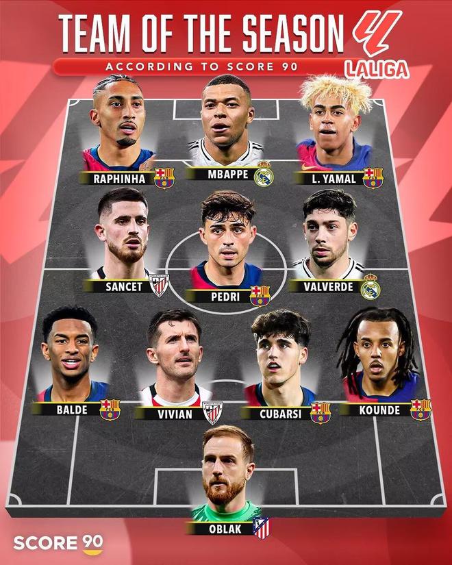 姆巴佩领衔!S90评本赛季西甲最佳阵容,亚马尔入选,马竞仅一人
